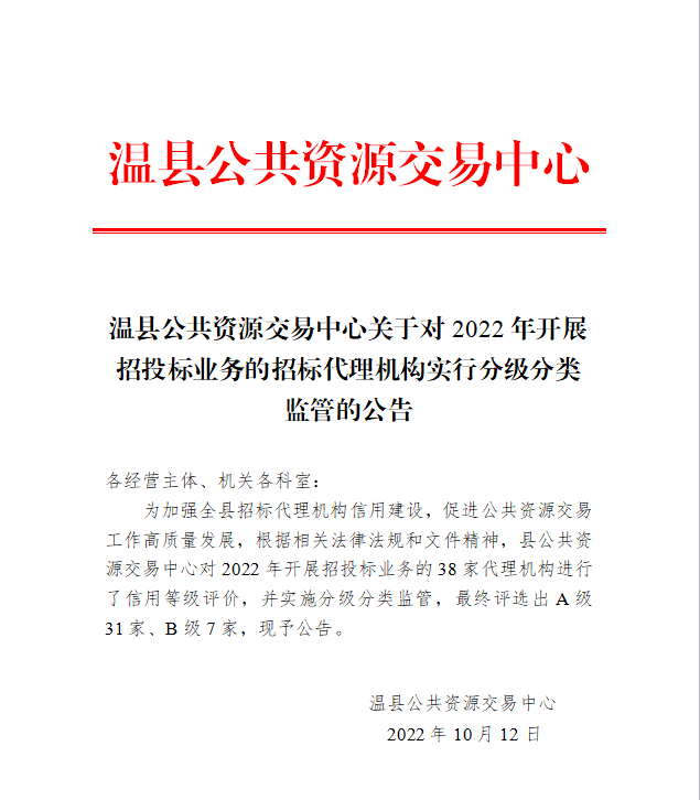 温县公共资源交易中心关于对2022年开展招投标业务的招标代理机构实行分级分类监管的公告