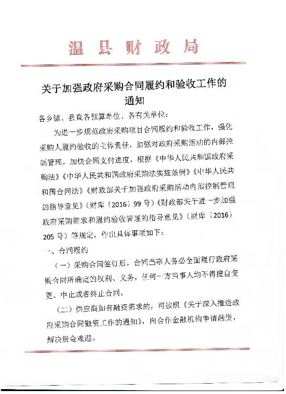 温县财政局关于加强政府采购合同履约和验收工作的通知
