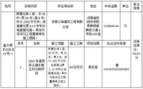 排序1:河南众举建设工程有限公司 最终报价:1138364.44元 得分:83.05;