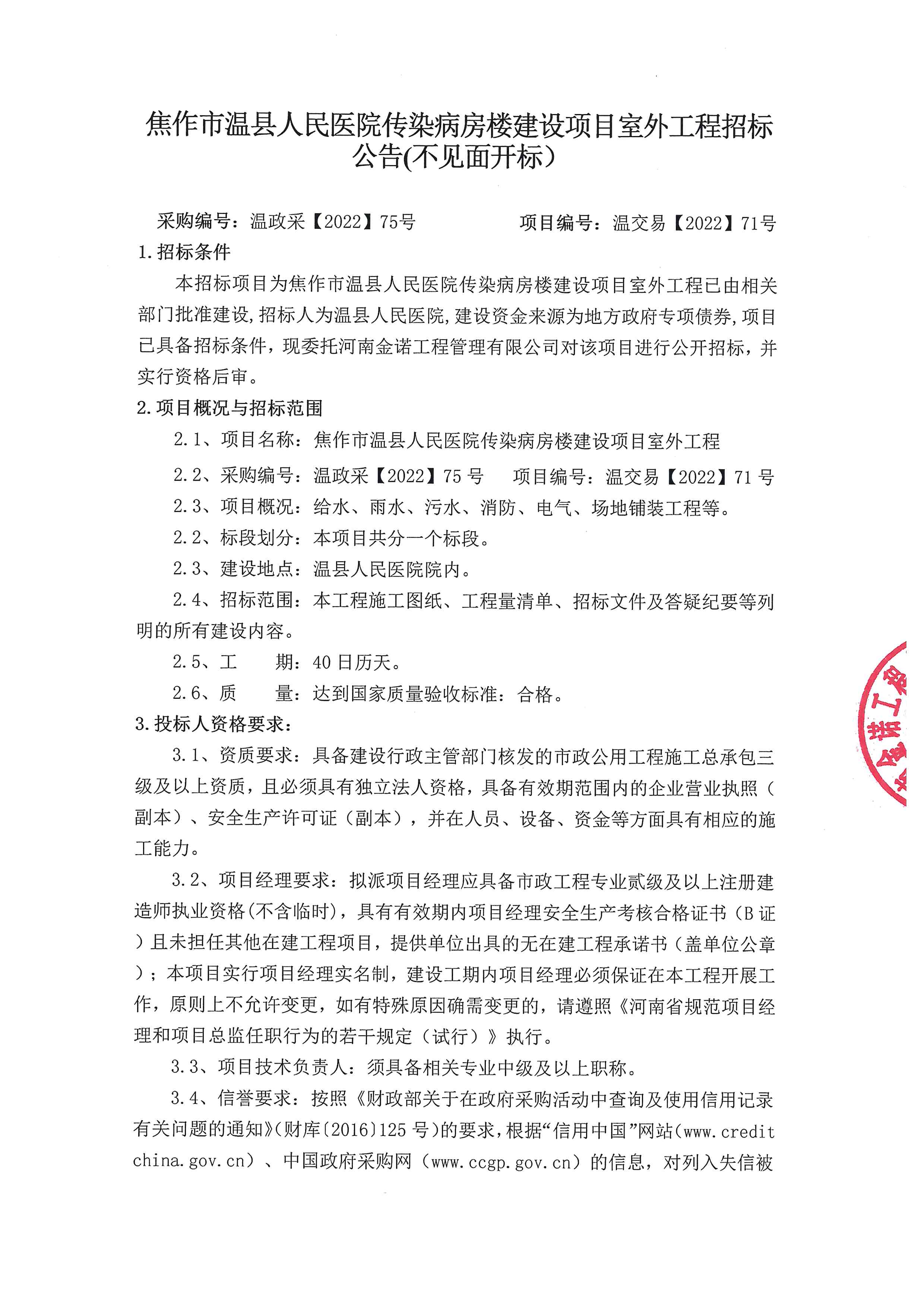 本招标项目为焦作市温县人民医院传染病房楼建设项目室外工程已由相关部门批准建设,招标人为温县人民医院,建设资金来源为地方政府专项债券,项目已具备招标条件,现委托河南金诺工程管理有限公司对该项目进行公开招标,并实行资格后审。