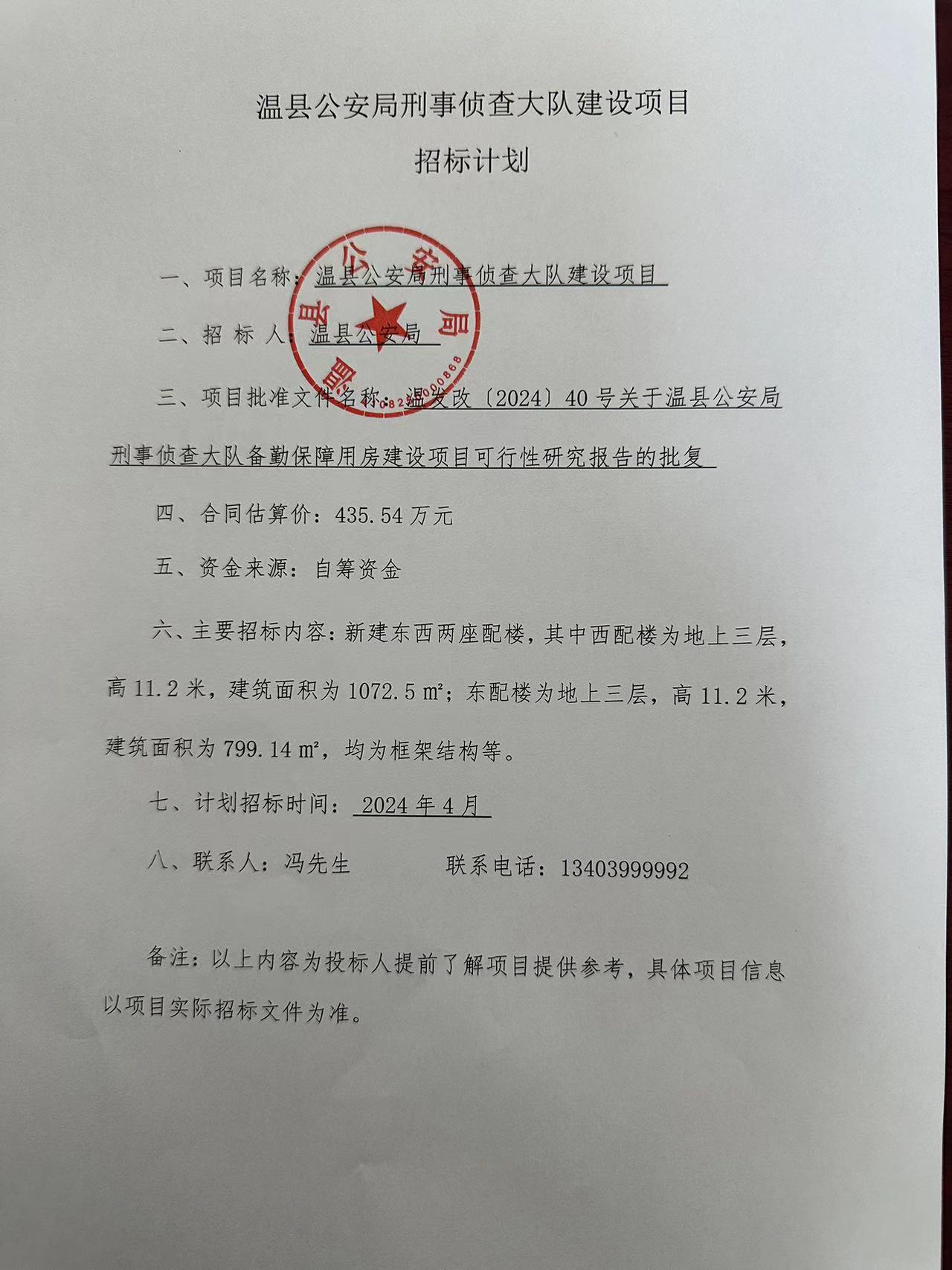 一、项目名称:温县公安局刑事侦查大队建设项目