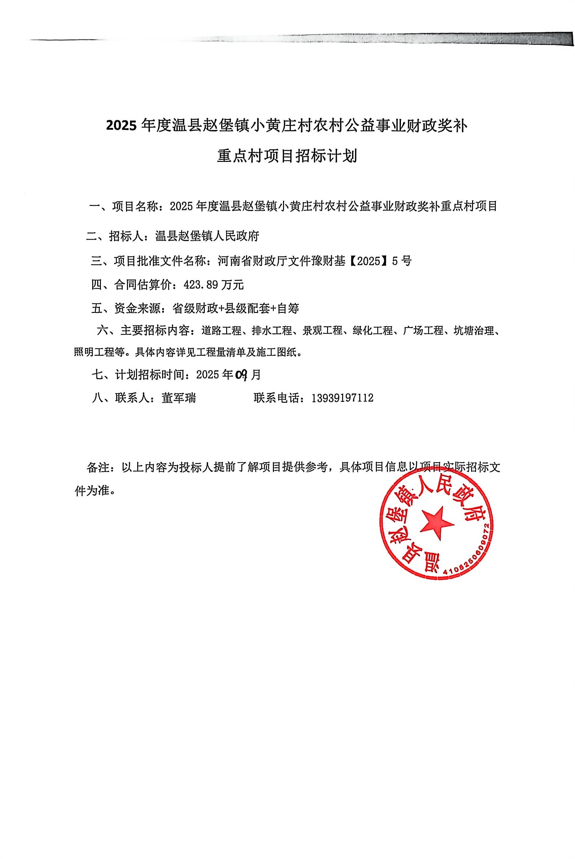 一、项目名称:2025年度温县赵堡镇小黄庄村农村公益事业财政奖补重点村项目