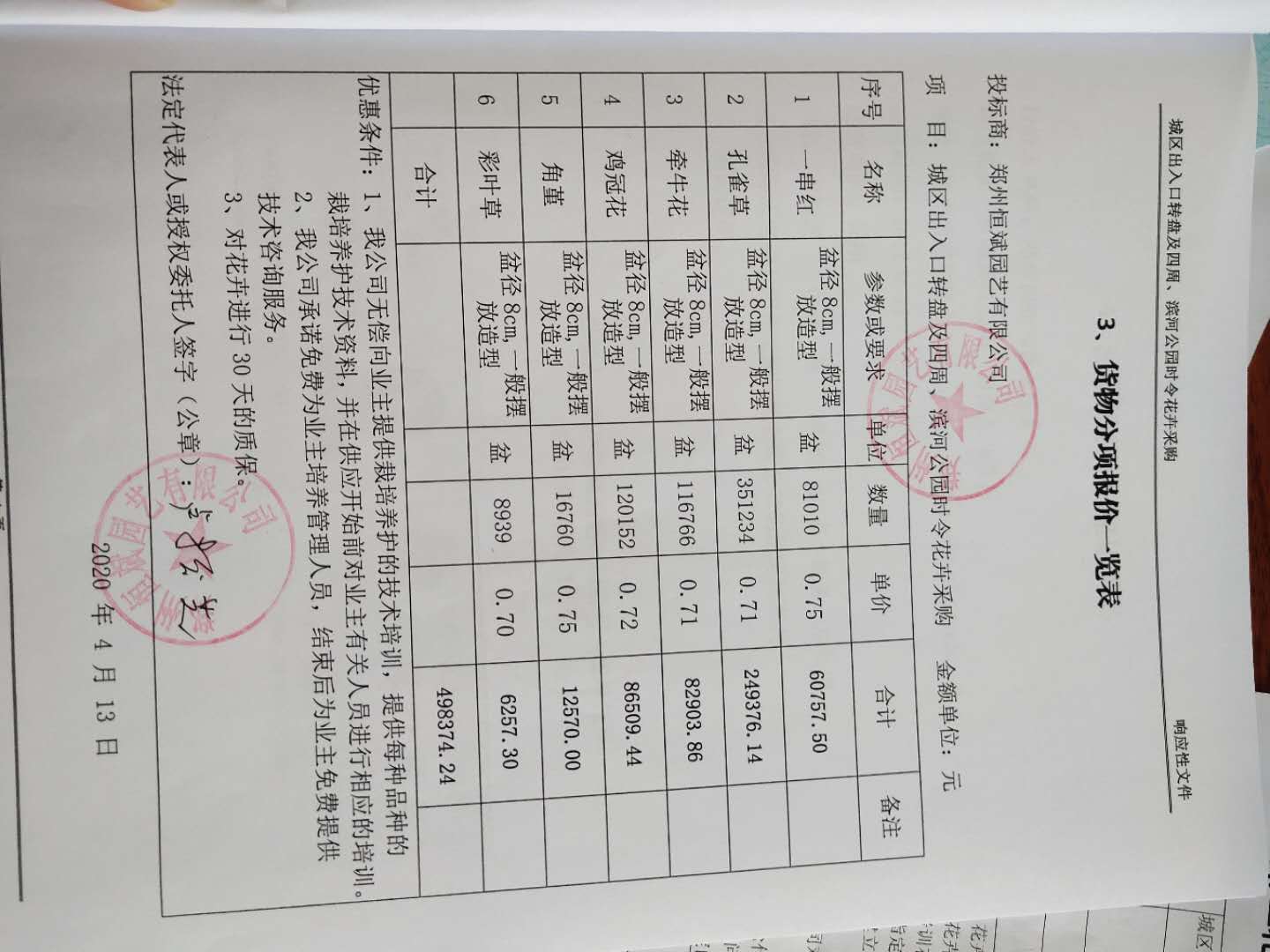1包 | 花卉运输、装卸、造型 | 郑州恒斌园艺有限公司 | 郑州市惠济区金杯路10号13号楼1单元10层1001号 | 小写:人民币 498284.85元 大写:肆拾玖万捌仟贰佰捌拾肆元捌角伍分 |