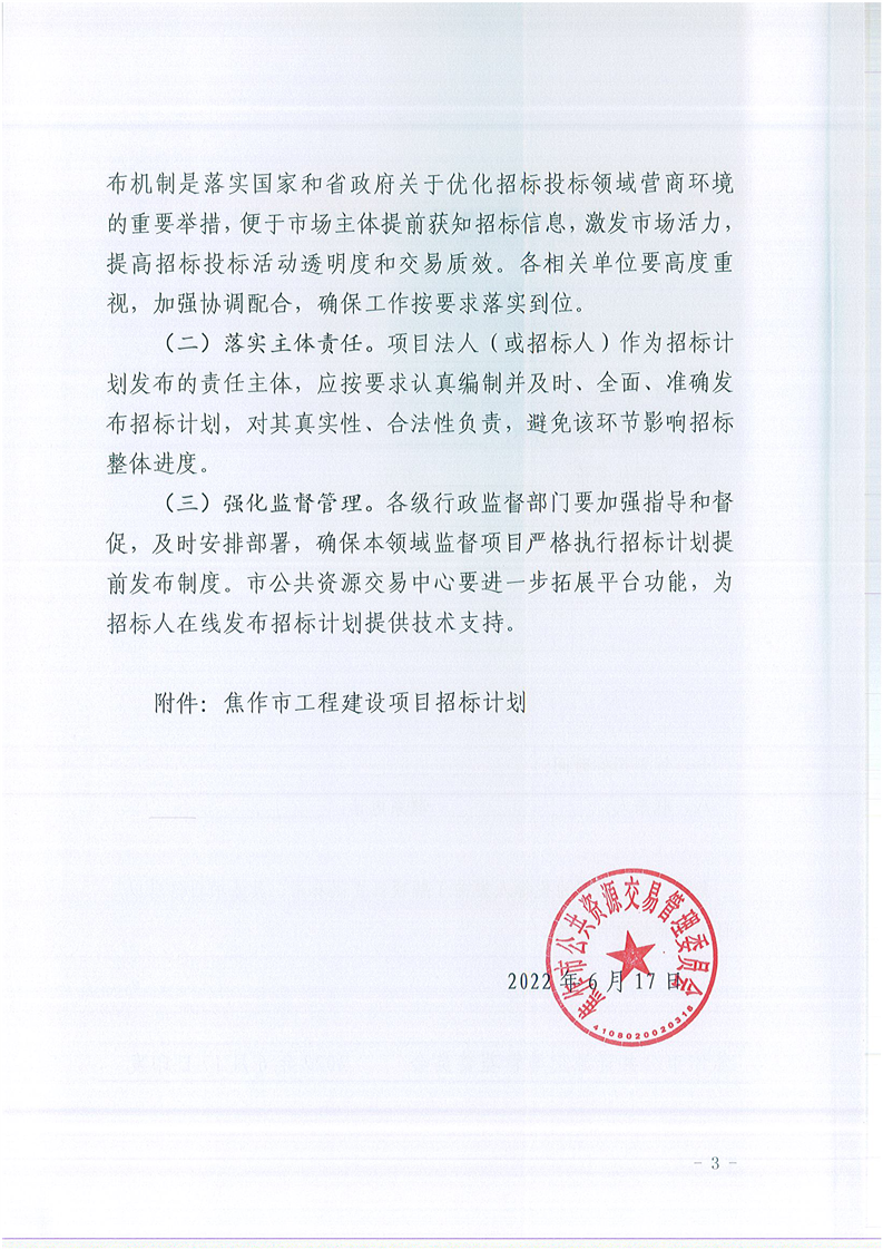 关于建立工程建设项目招标计划提前发布机制的通知 焦公管委〔2022〕2号