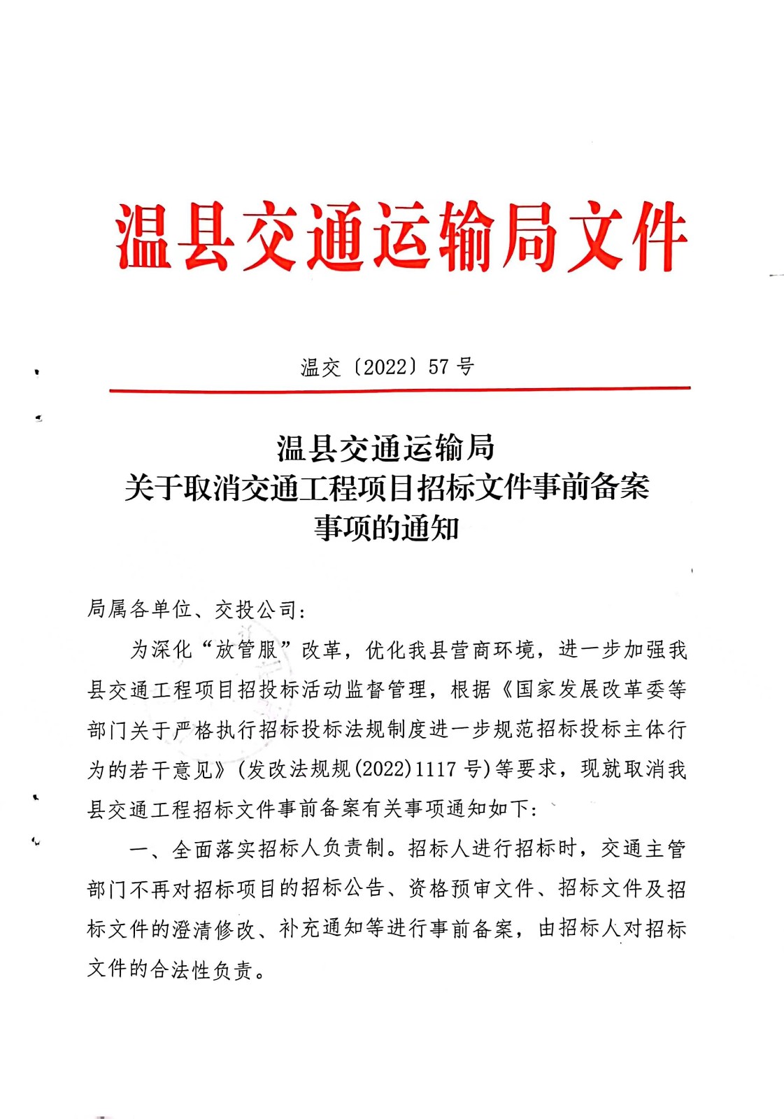 温县交通运输局关于取消交通工程项目招标文件事前备案事项的通知