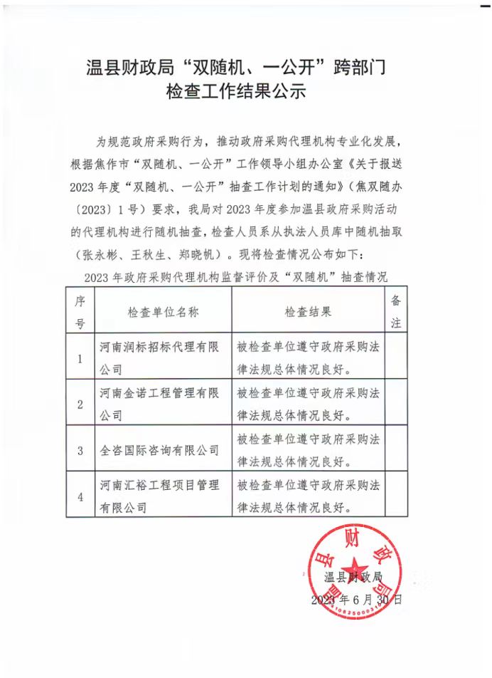 温县财政局“双随机、一公开”跨部门检查工作结果公示